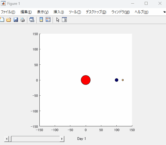 6,7行目でDay1の点のみplotしています。こちらは地球と月の軌跡をplotするためのものです。これらのplotもhという変数に格納していますが、先ほどと同じ理由で関数の入力引数に使用するためです。