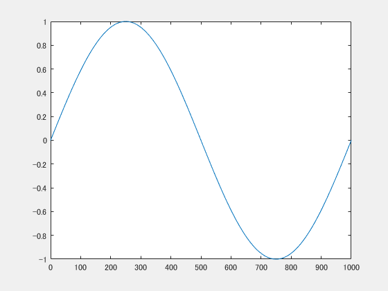 plot(t,Data(:,1));下の図のようにxが0~1000の1周期のsinカーブが表示されます。