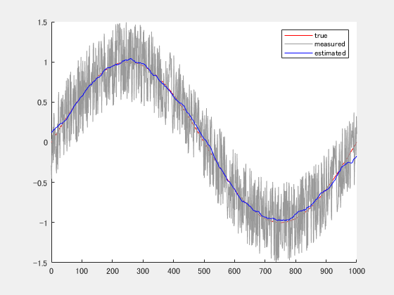 今回作成するfigureを確認しておきます。下の図のように真値(true)に対してノイズを含んだデータ(measured)から移動平均を用いて真値を推測しています(estimated)。